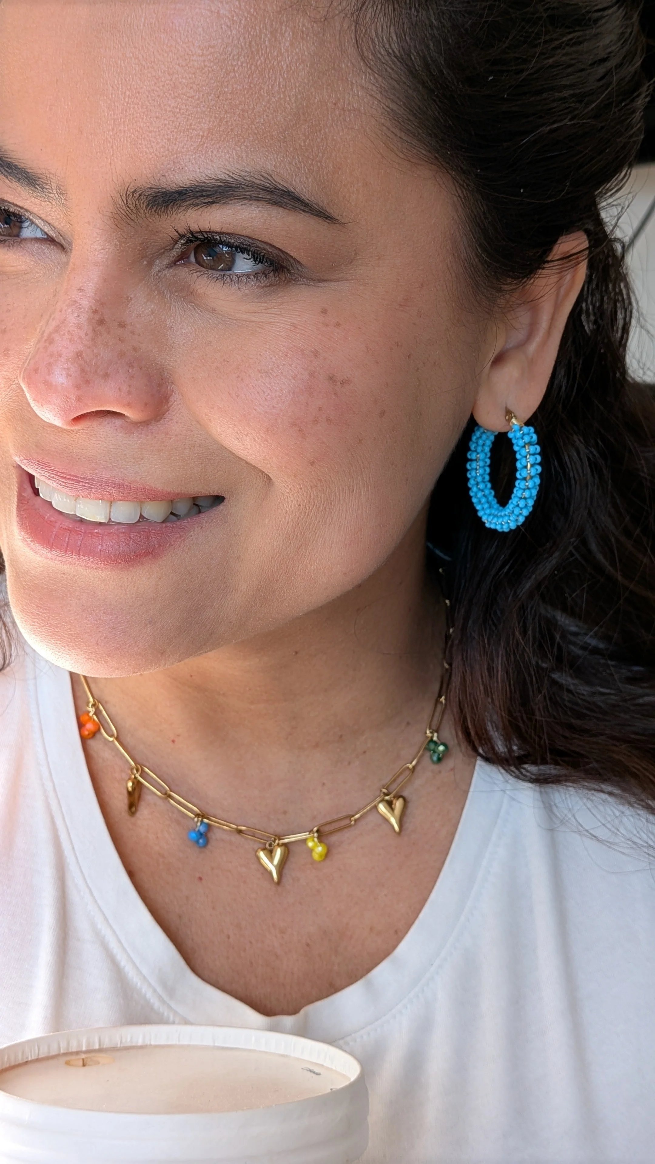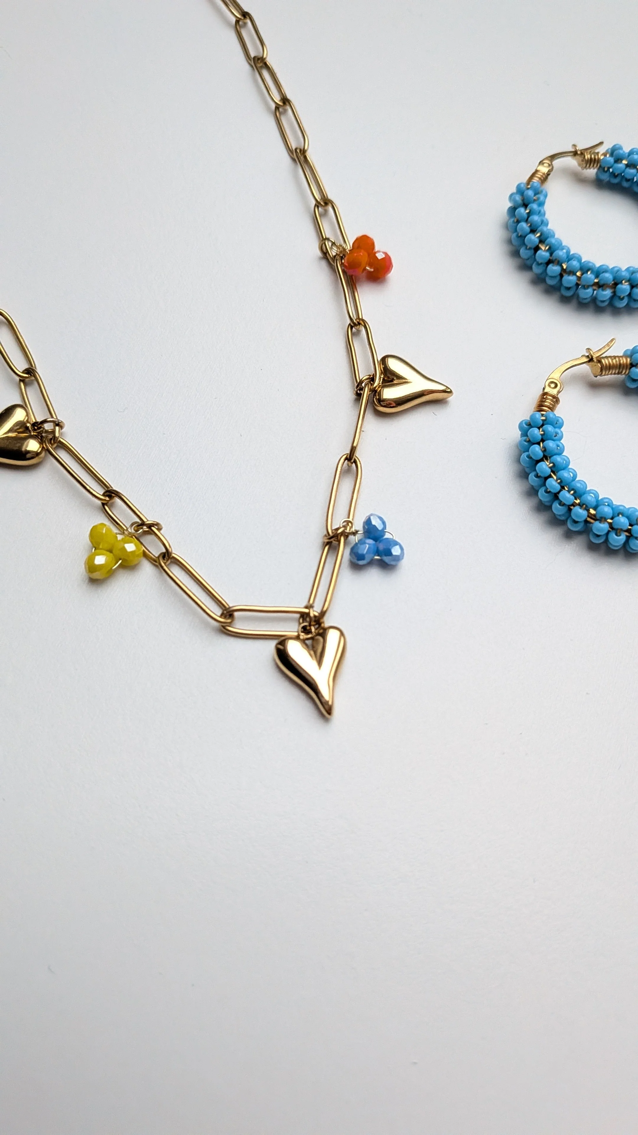 Schöne Kette mit Herzen und Perlen Anhängern und Perlen - Creolen, die die ganze Freude der Jahreszeit in deine Outfits bringen. Dieses Set kann tagsüber oder abends im Sonnige Tage getragen werden. Du kannst mit anderen farbigen Produkte aus unsere Shop kombinieren.
